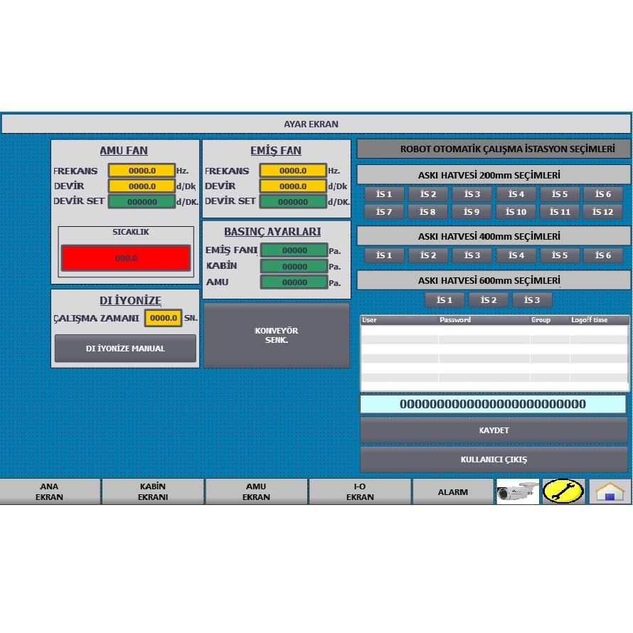 Otomasyon sisteminde en 3 seviyede yetki sınırlandırılması yapılabilmektedir. Bunlar operatör, boyahane yöneticisi ve bakım ekibi için olabilmektedir.